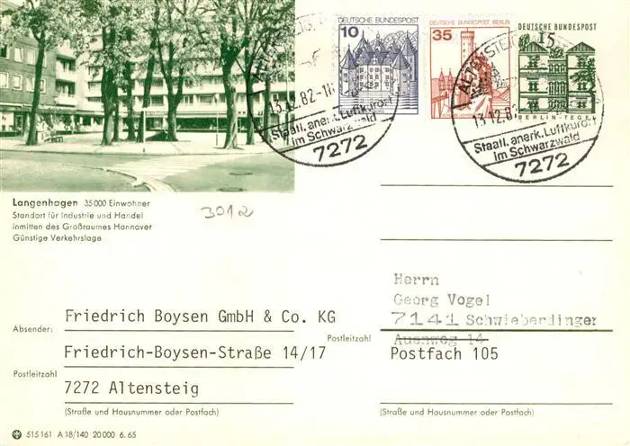 Langenhagen_Hannover Partie in der Innenstadt Langenhagen Hannover postalisch gelaufen 1982 Ganzsache (eingedruckte Briefmarke) Erhaltung siehe scans [FriedD77] Ganzsache (eingedruckte Briefmarke) Frierer