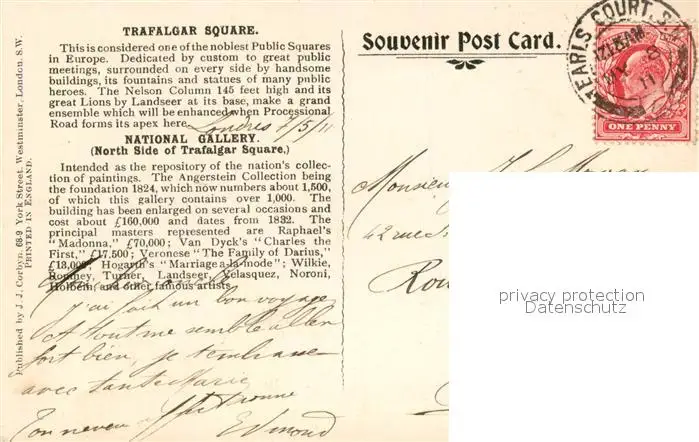 London Trafalgar Square and National Gallery Nelson Column London postalisch gelaufen 1911 Erhaltung siehe scans [FriedD77] Frierer