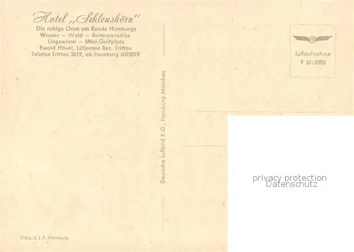 Luetjensee Hotel Schleushoern Luetjensee postalisch nicht gelaufen 1961 Fliegeraufnahme Erhaltung siehe scans [FriedD77] Fliegeraufnahme Frierer