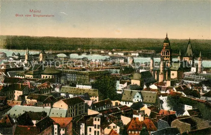 Mainz_Rhein Stadtpanorama mit Dom Rheinbruecke Blick vom Stephansturm Mainz Rhein postalisch nicht gelaufen 1919 Erhaltung siehe scans [FriedD77] Frierer