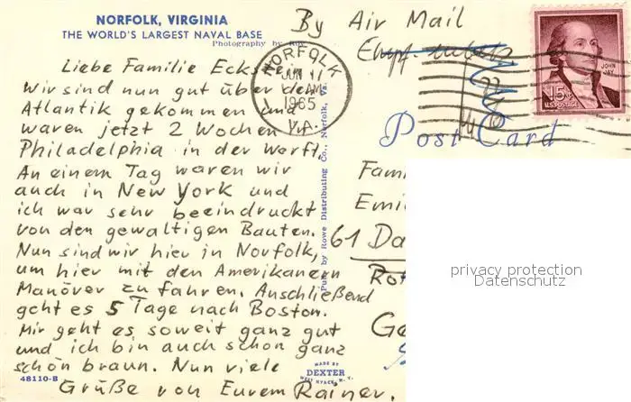 Marine Norfolk Naval Base Marine postalisch gelaufen 1965 Erhaltung siehe scans [PaolaD17] PaolPID1