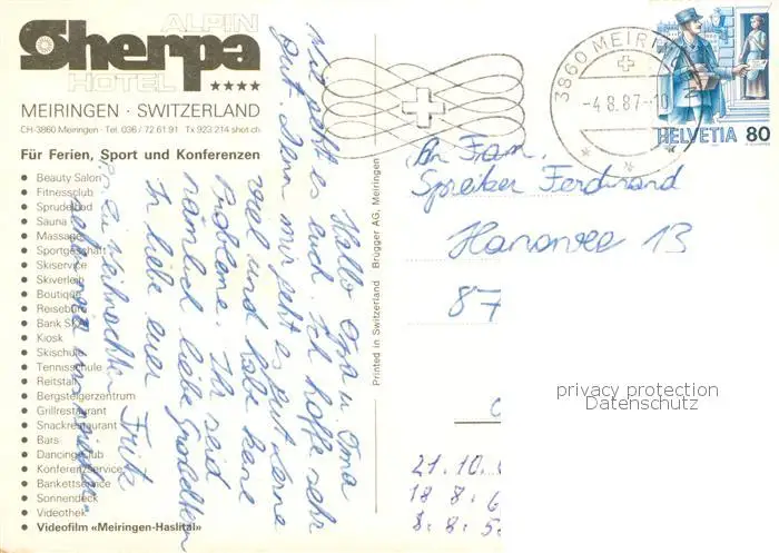 Meiringen_BE Alpin Sherpa Hotel Aussenansicht Meiringen BE postalisch gelaufen 1987 Erhaltung siehe scans [LiesaD40] LiesID40