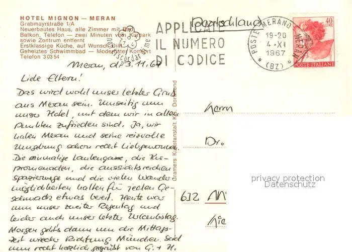 Meran_Merano Hotel Mignon Meran Merano postalisch gelaufen 1967 Erhaltung siehe scans [FriedD77] Frierer