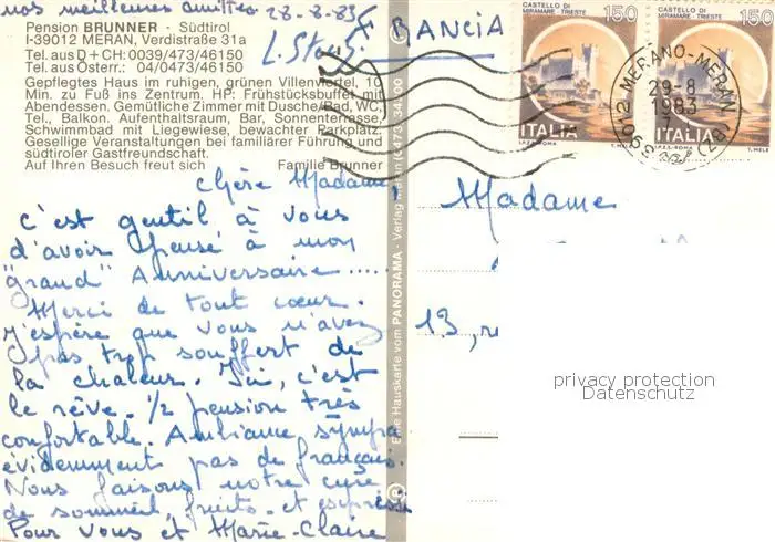 Meran_Merano Pension Brunner Pool Terrasse Ortspartie Meran Merano postalisch gelaufen 1983 Erhaltung siehe scans [WerneD78] WernPID7