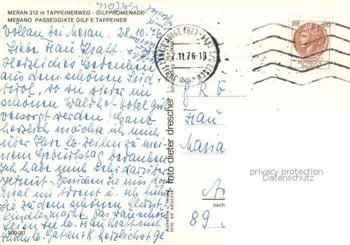 Meran_Merano Tappeinerweg Gilfpromenade Passeggiate Gilf e Tappeiner Meran Merano postalisch gelaufen 1976 Erhaltung siehe scans [FriedD77] Frierer