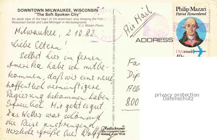 14060696 Milwaukee Wisconsin USA Aerial view of the heart of downtown First Wisconsin Center Lake Michigan postalisch gelaufen Fliegeraufnahme Erhaltung siehe scans [FriedD77] Fliegeraufnahme old postcard Frie Katcode 14140520000000