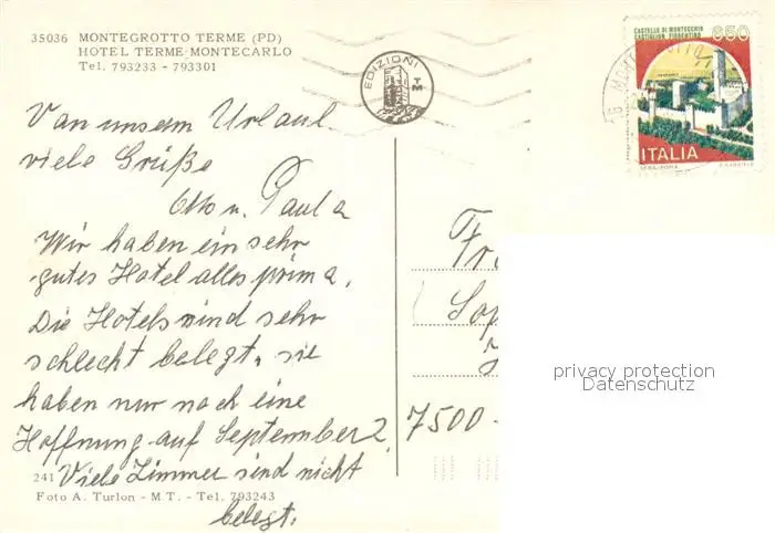 Montegrotto_Terme Hotel Terme Montecarlo Montegrotto Terme postalisch gelaufen nach 1965 Erhaltung siehe scans [FriedD77] Frierer