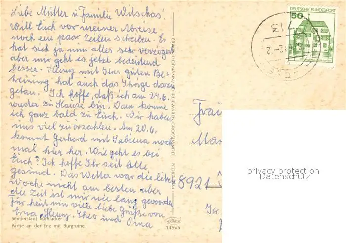 Muehlacker Partie an der Enz mit Burgruine Muehlacker postalisch gelaufen nach 1965 Erhaltung siehe scans [WerneD78] WernPID7