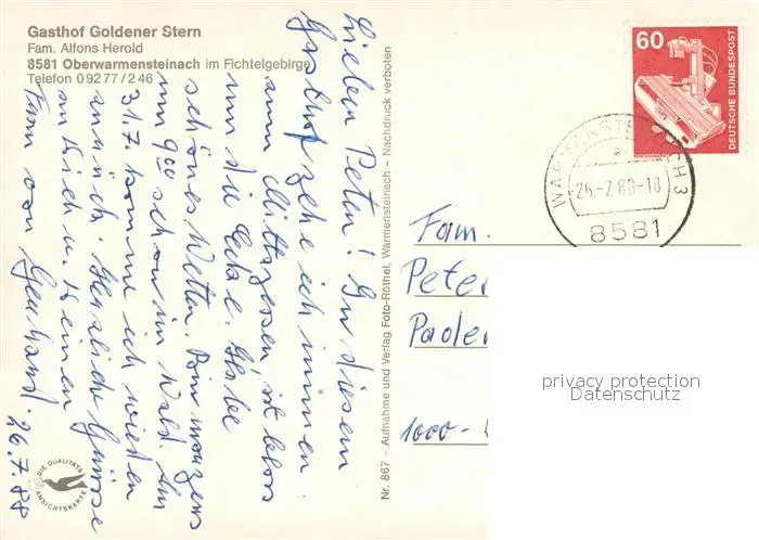 Oberwarmensteinach Gasthof Goldener Stern Oberwarmensteinach postalisch gelaufen 1988 Erhaltung siehe scans [WerneD78] WernPID7
