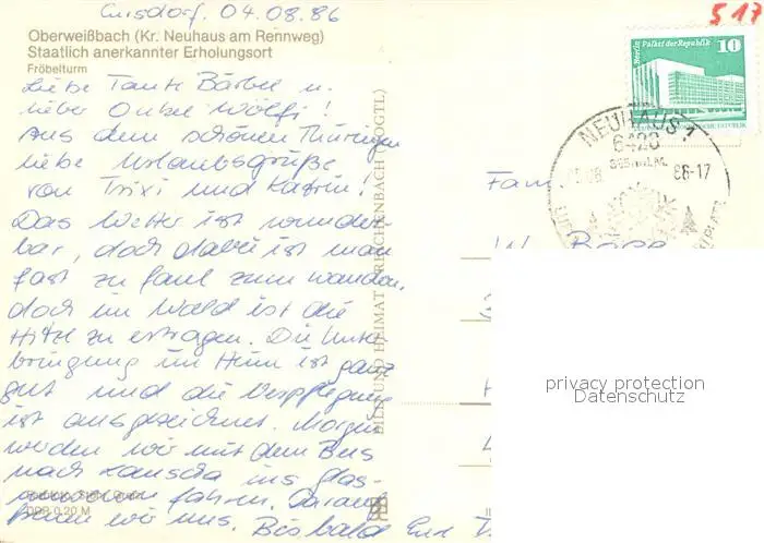 Oberweissbach Froebelturm Oberweissbach postalisch gelaufen 1986 Erhaltung siehe scans [WerneD78] WernPID7