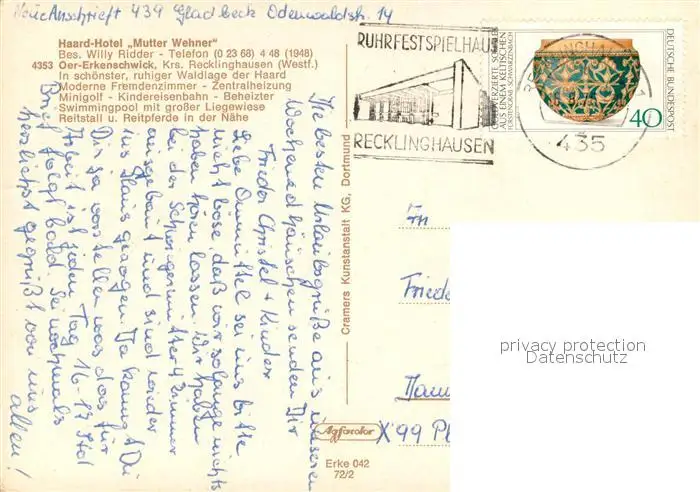 Oer-Erkenschwick Haard-Hotel Mutter-Wehner Oer-Erkenschwick postalisch gelaufen 1976 Erhaltung siehe scans [LiesaD40] LiesID40