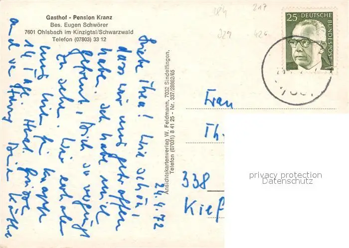 Ohlsbach Gasthof-Pension Kranz Ohlsbach postalisch gelaufen 1972 Erhaltung siehe scans [PaolaD17] PaolPID1