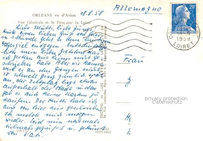 Orleans_45_Loiret Vue générale et pont sur la Loire vue aérienne postalisch gelaufen 1958 Erhaltung siehe scans [FriedD77] Frierer
