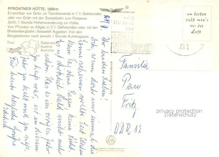 Pfrontnerhuette_1800m_Tannheimertal_AT Fliegeraufnahme mit Aggenstein postalisch nicht gelaufen nach 1965 Erhaltung siehe scans [WerneD78] WernPID7