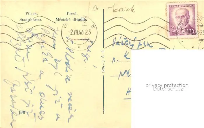 Pilsen_Tschechien Stadttheater Pilsen Tschechien postalisch gelaufen 1946 Erhaltung siehe scans [KathaD81] Kathoren