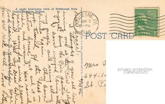Pittsburgh View from Castle Shannon Incline at Night Pittsburgh postalisch gelaufen 1946 Erhaltung siehe scans [WerneD78] WernPID7