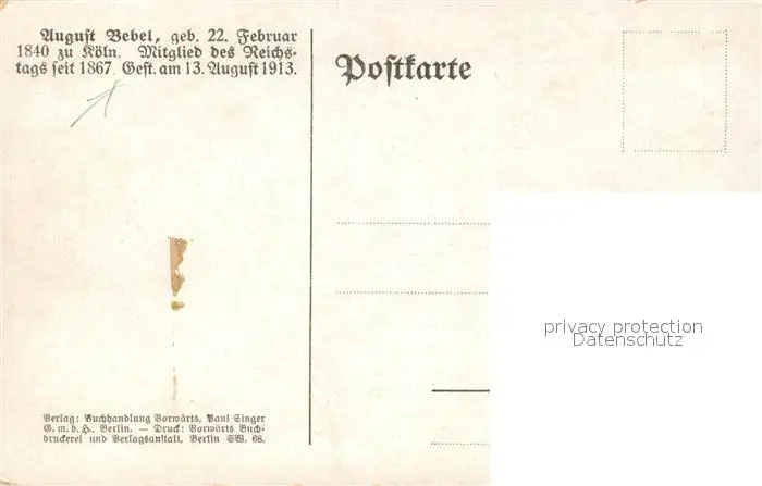 Politiker August Bebel Politiker postalisch nicht gelaufen bis 1920 Erhaltung siehe scans [PaolaD17] PaolPID1