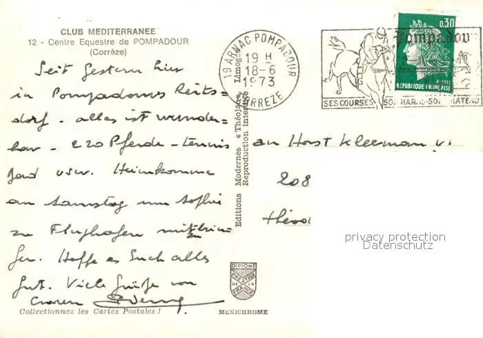 Pompadour Club Mediterranee Centre Equestre Pompadour postalisch gelaufen 1973 Erhaltung siehe scans [KathaD81] Kathoren