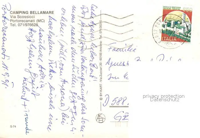 Portorecanati Camping Bellamare Portorecanati postalisch gelaufen 1991 Erhaltung siehe scans [KathaD81] Kathoren