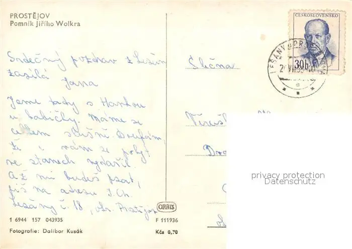 Prostejov Pomnik Jiriho Wolkra Prostejov postalisch gelaufen 1921-1965 Erhaltung siehe scans [WerneD78] WernPID7
