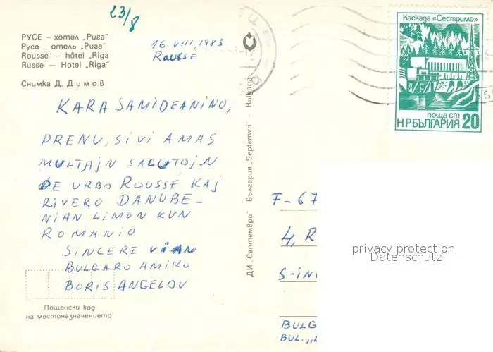 Pyce_Russe_Rousse Hotel Riga Pyce_Russe_Rousse postalisch gelaufen 1983 Erhaltung siehe scans [FriedD77] Frierer
