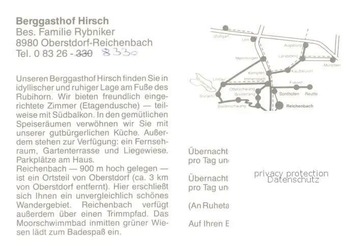Reichenbach_Oberstdorf Berggasthof Hirsch Reichenbach_Oberstdorf postalisch nicht gelaufen nach 1965 Werbekarte (keine Postkarte) Erhaltung siehe scans [LiesaD40] Werbekarte (keine Postkarte) LiesID40