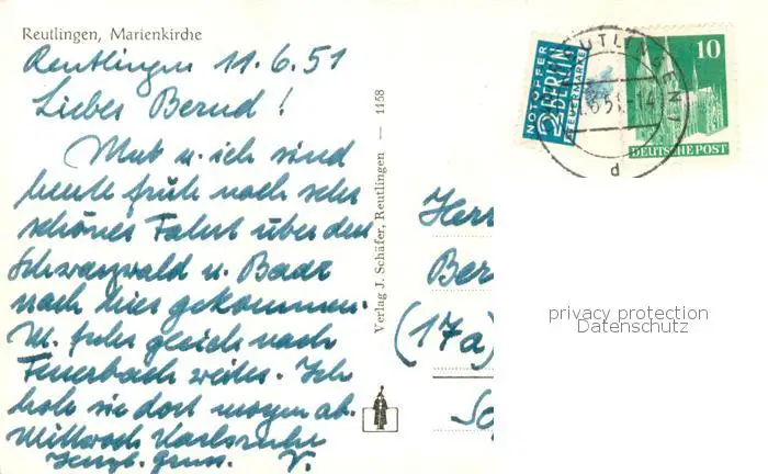 Reutlingen_BW Marienkirche postalisch gelaufen 1951 Erhaltung siehe scans [FriedD77] Frierer