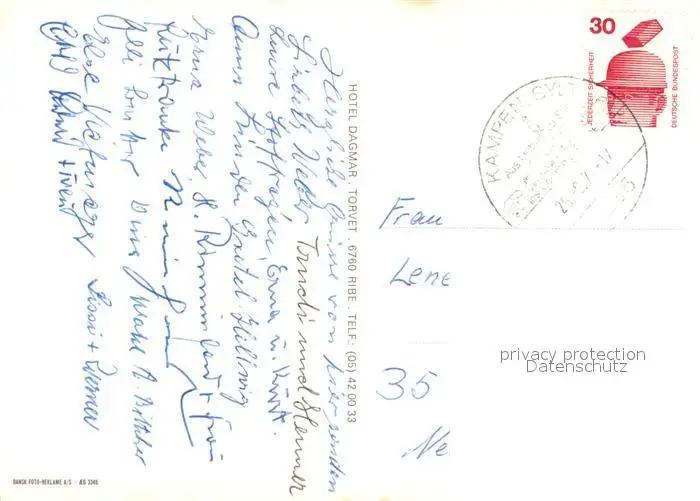 Ribe Hotel Dagmar Ribe postalisch gelaufen nach 1965 Erhaltung siehe scans [LiesaD40] LiesID40