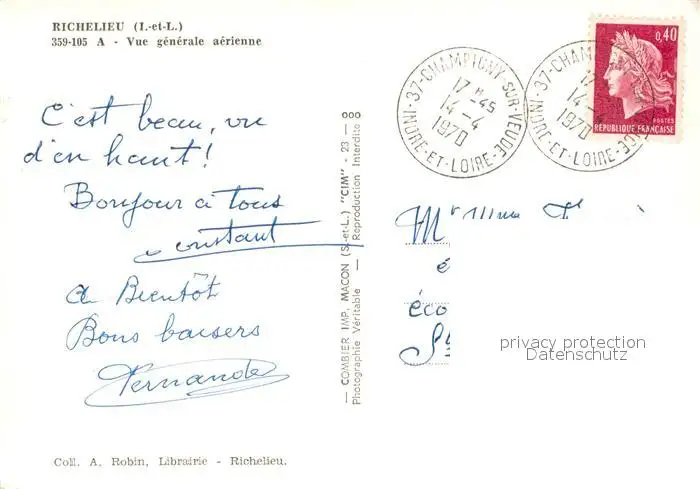 Richelieu Vue generale aerienne Richelieu postalisch gelaufen 1970 Erhaltung siehe scans [WerneD78] WernPID7