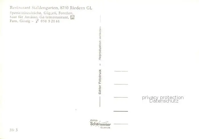 Riedern_GL Restaurant Staldengarten Riedern_GL postalisch nicht gelaufen 1921-1965 Erhaltung siehe scans [FriedD77] Frierer