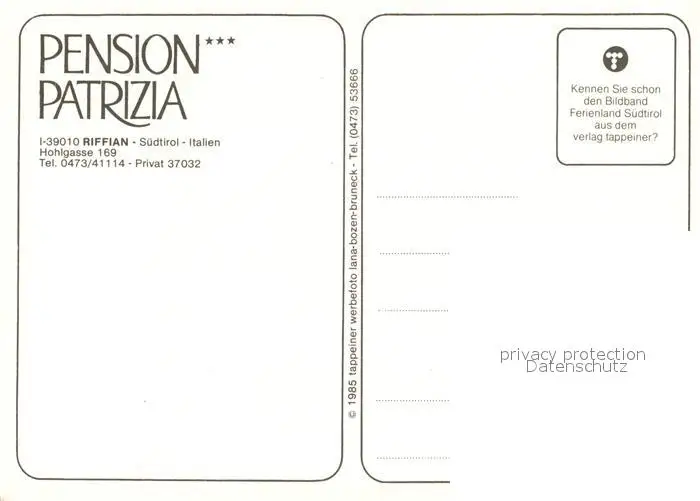 Riffian_Meran Pension Patrizia Riffian Meran postalisch nicht gelaufen nach 1965 Erhaltung siehe scans [LiesaD40] LiesID40