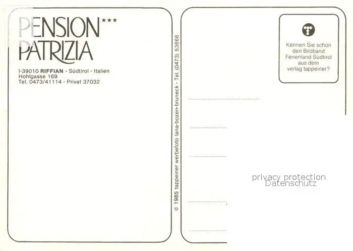 Riffian_Meran Pension Patrizia Swimming Pool Riffian Meran postalisch nicht gelaufen nach 1965 Erhaltung siehe scans [FriedD77] Frierer