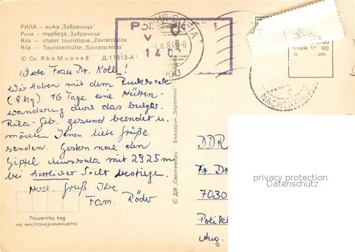 Rila Touristenhuette Savratschitza Rila postalisch gelaufen 1984 Erhaltung siehe scans [FriedD77] Frierer