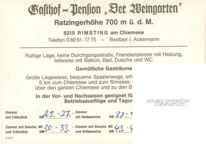 Rimsting Gasthof Pension Der Weingarten Terrasse Rimsting postalisch nicht gelaufen nach 1965 Werbekarte (keine Postkarte) Erhaltung siehe scans [FriedD77] Werbekarte (keine Postkarte) Frierer