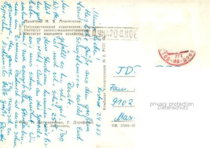 Rostow_am_Don Denkmal Lomonosov Rostow_am_Don postalisch gelaufen nach 1965 Erhaltung siehe scans [Darjalle] Darjolle