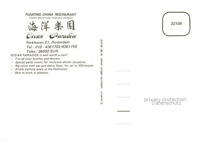 Rotterdam Floating China Restaurant Ocean Paradise Sendeturm Rotterdam postalisch nicht gelaufen nach 1965 Erhaltung siehe scans [FriedD77] Frierer