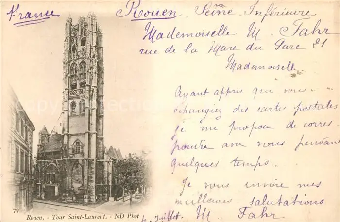 Rouen Tour Saint Laurent Rouen postalisch gelaufen 1901 Erhaltung siehe scans [FriedD77] Frierer