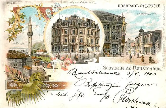 Roustchouk_Ruse Kategorie Alte Ansichtskarten Postkarten bx76078 Roustchouk_Ruse Moschee Alexandrovscka Maison de freres Sankt Simionoff Roustchouk_Ruse postalisch gelaufen 1900 Erhaltung siehe scans [KathaD81]