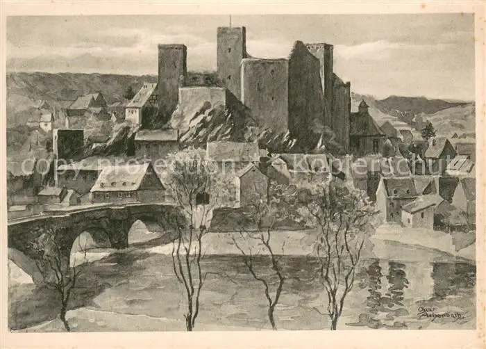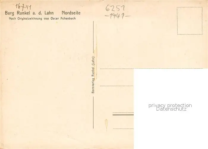 Runkel_Lahn Burg Runkel Zeichnung Runkel_Lahn postalisch nicht gelaufen 1941 Erhaltung siehe scans [WerneD78] WernPID7