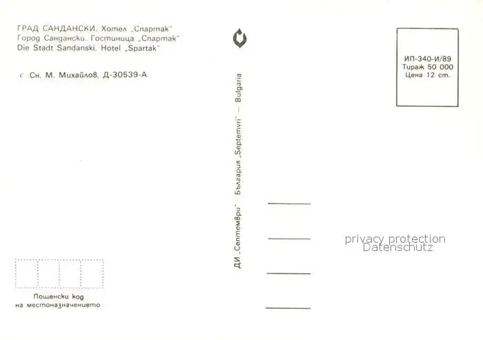 Sandanski Hotel Spartak Sandanski postalisch nicht gelaufen 1989 Erhaltung siehe scans [FriedD77] Frierer