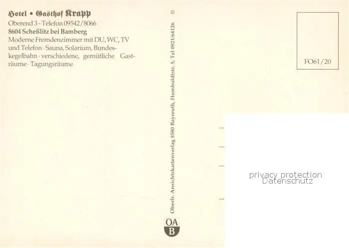 Schesslitz Hotel Gasthof Krapp Restaurant Schesslitz postalisch nicht gelaufen nach 1965 Erhaltung siehe scans [FriedD77] Frierer