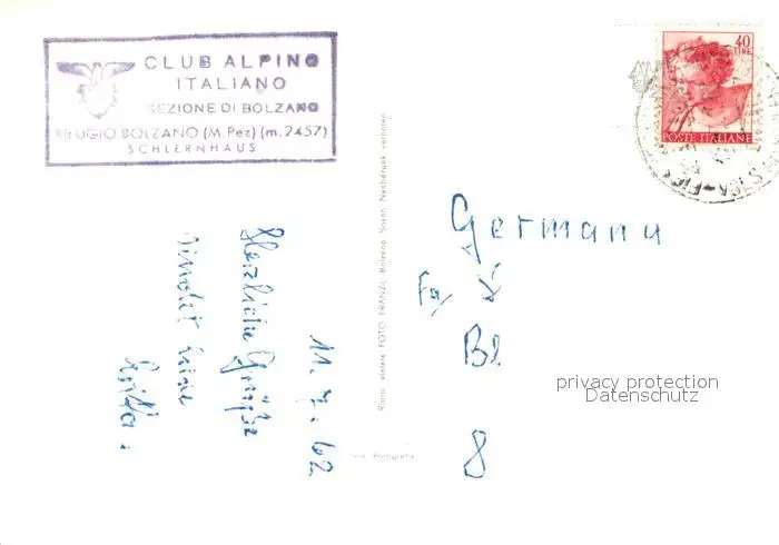 Schlernhaeuser gegen Rosengartengruppe Dolomiten Schlernhaeuser postalisch gelaufen 1962 Erhaltung siehe scans [FriedD77] Frierer