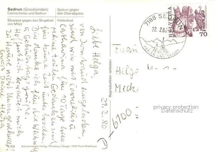 Sedrun Panorama Eisenbahn Skilift Hallenbad Sedrun postalisch gelaufen 1980 Erhaltung siehe scans [WerneD78] WernPID7