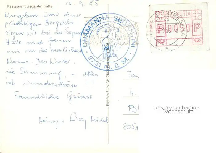 Segantinihuette Restaurant Segantinihuette postalisch gelaufen 1985 Erhaltung siehe scans [KathaD81] Kathoren