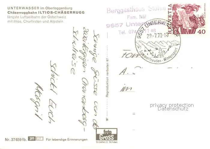 Seilbahn Chaeserrugg Unterwasser Obertoggenburg Seilbahn postalisch gelaufen 1978 Erhaltung siehe scans [PaolaD17] PaolPID1