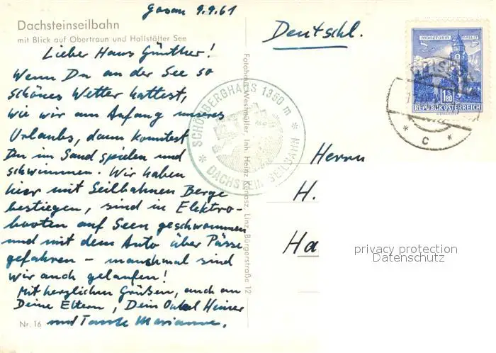 Seilbahn Dachstein Obertraun Hallstaetter See Seilbahn postalisch gelaufen 1961 Erhaltung siehe scans [PaolaD17] PaolPID1