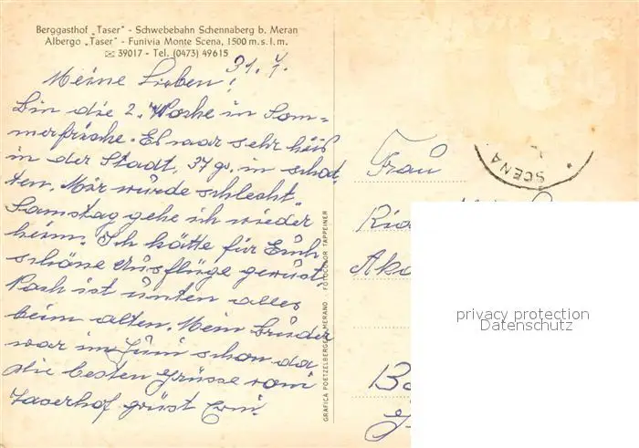 Seilbahn Schennaberg Meran Berggasthof Taser Seilbahn postalisch gelaufen nach 1965 Erhaltung siehe scans [PaolaD17] PaolPID1