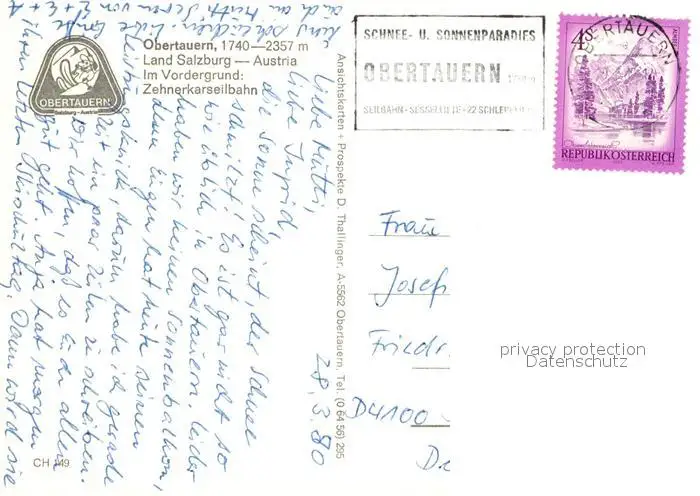 Seilbahn Zehnerkar Obertauern Seilbahn postalisch gelaufen 1980 Erhaltung siehe scans [PaolaD17] PaolPID1