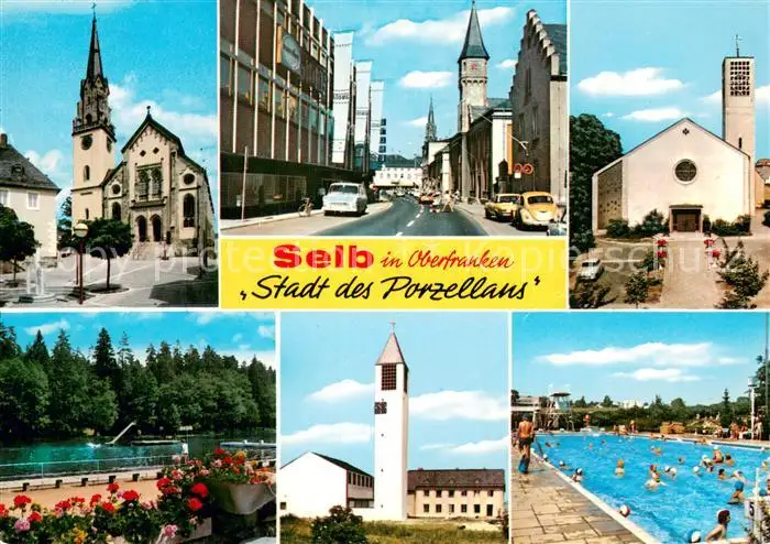 AK / Ansichtskarte Selb Kirchen Strassenpartie Freibad Selb