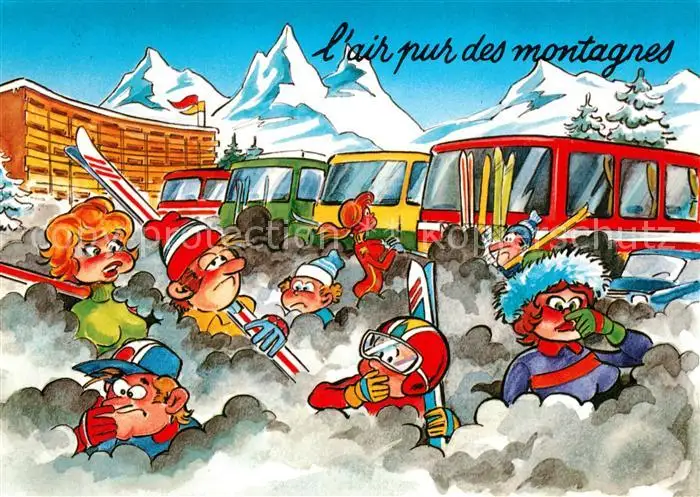 AK / Ansichtskarte Skifahren Autobus Smog Humor Comic